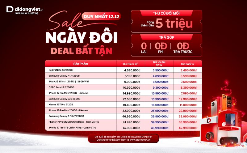 Bảng giá smartphone áp dụng trong chương trình sale đôi ngày 12/12 tại Di Động Việt.