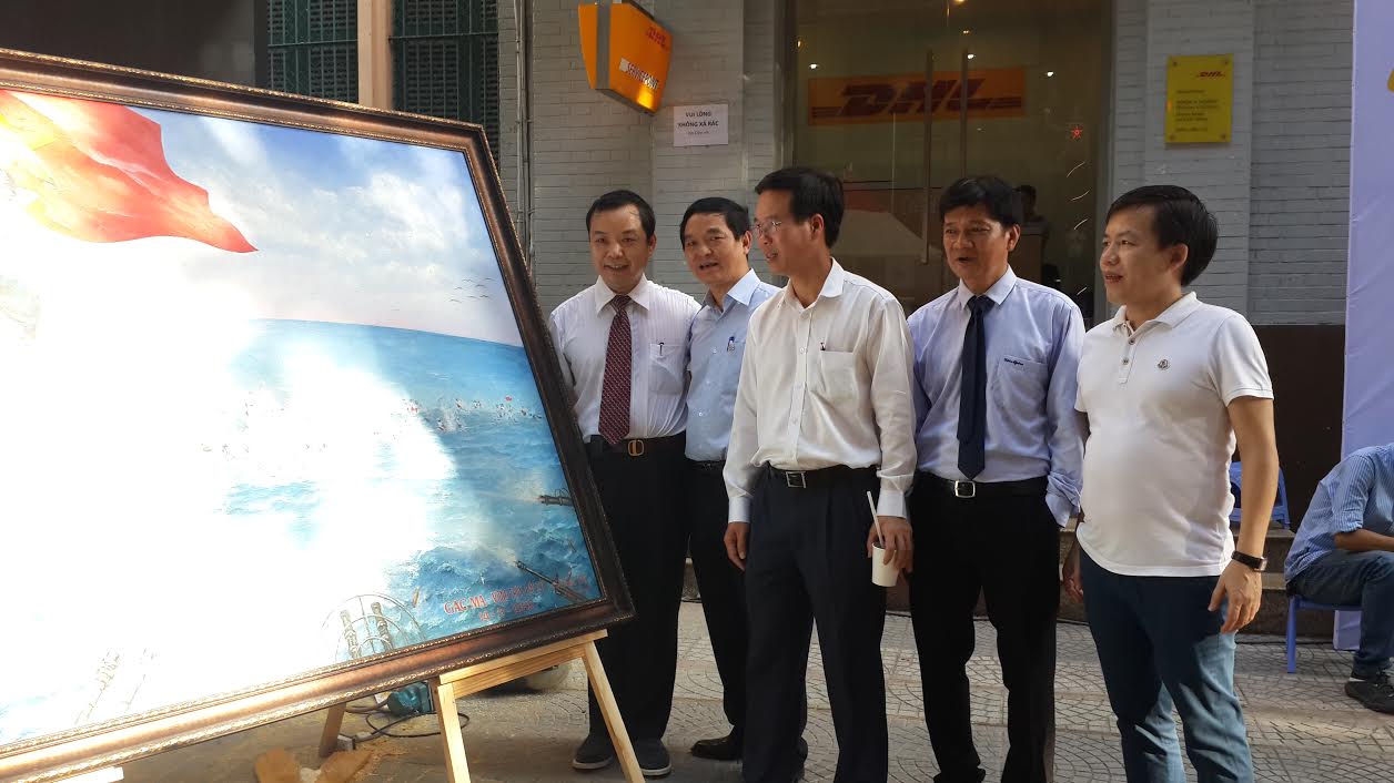 Lãnh đạo TP bên cạnh bức tranh Gạc Ma - Vòng Tròn Bất Tử đã được đấu giá để giúp 64 gia đình Liệt sĩ Gạc Ma