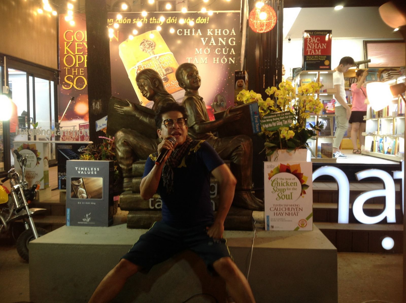 Bức Tượng Đọc Sách Hạt Giống Tâm Hồnvới hai em bé tựa lưng đọc sách của Pháp từ thế kỷ 17 được nghệ nhân điêu khắc bậc thầy Lâm Quang Nới phục chế sinh động có chỗ ngồi chụp ảnh cho bạn đọc và du khách. Đây là điểm chụp hình miễn phí đẹp nhất và được các bạn trẻ ưa thích nhất tại Đường Sách. Hàng ngàn tấm hình của các bạn trẻ chụp ở đây đã lan truyền tinh thần đọc sách trên Facebook và mạng xã hội những ngày qua với sự lan tỏa mạnh mẽ chứng tỏ các bạn trẻ không thờ ơ với văn hóa đọc