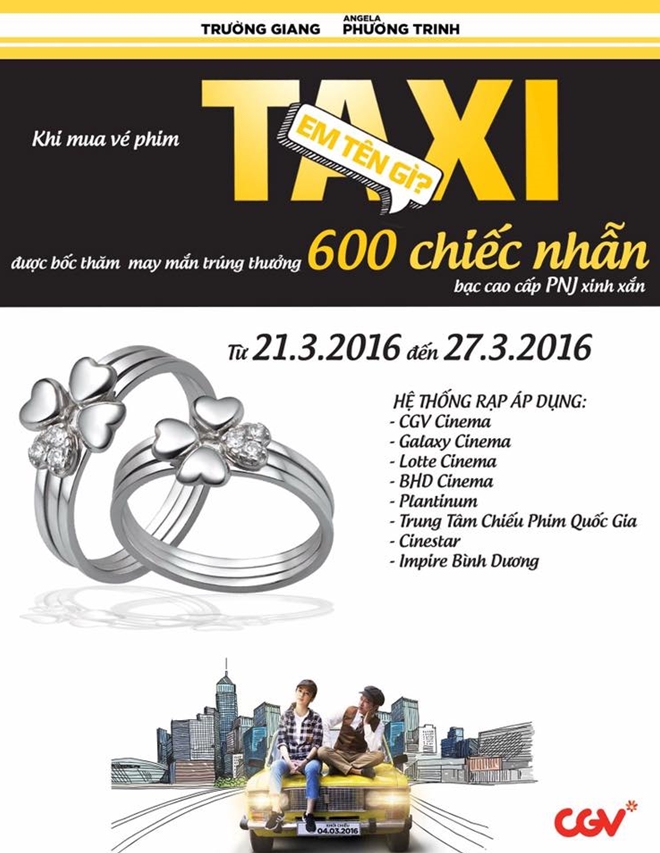 Nhằm tri ân sự ủng hộ khán giả trong suốt thời gian qua, đoàn phim“Taxi, em tên gì?” cùng nhà phát hành CGV vừa quyết định tặng 600 chiếc nhẫn bạc cao cấp PNJ xinh xắn với hình thức bốc thăm may mắn trúng thưởng.