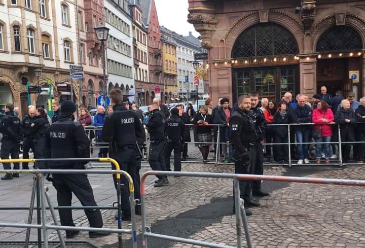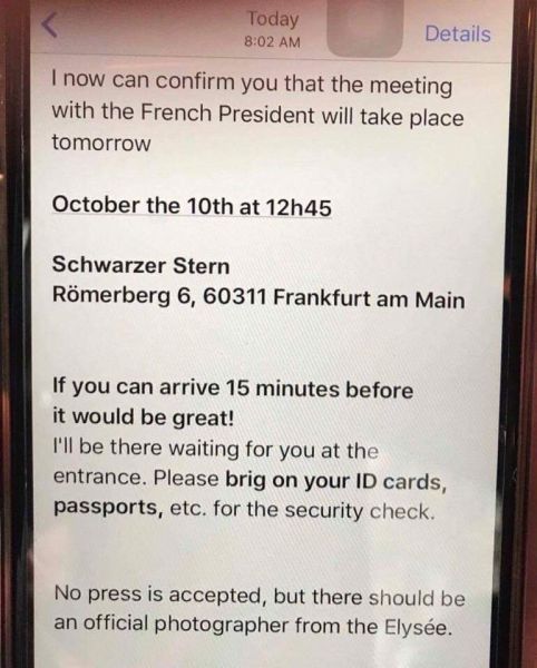 Địa điểm cuộc gặp Tổng Thống Macron chỉ được báo trước 60 phút tại Romerberb 6, 60311 Frankfurt am Main, được kiểm tra an ninh nghiêm ngặt. Không một báo chí, thông tấn nước ngoài nào được tham dự và chỉ có một chuyên gia ảnh chính thức từ Điện Elysee đi cùng được phép vào.