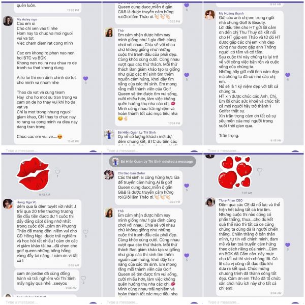 Trong đó có 1 chia sẻ rất xúc động : Thí sinh Jelly Thảo chia sẻ : “ Em cảm nhận hôm nay mình giống như 1 thành viên trong gia đình cùng chơi với nhau, chia sẻ với nhau chứ không giống như 1 cuộc thi tranh đấu của phái đẹp. Cùng khóc, cùng cười. Cùng nhau vượt qua thử thách. Mỗi thử thách BGK tạo ra, giống như giúp các thí sinh tìm thêm nguồn cảm hứng, khơi dậy tìm năng của các thí sinh. Em mong rằng mỗi thành viên của Golf Queen sẽ tìm niềm vui sống, cười nhiều hơn, làm việc không quên hưởng thụ nhé các chị. Mình cùng nhau trải nghiệm và hoàn thành tốt các mục tiêu nha!”