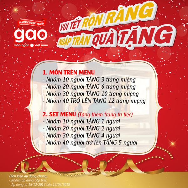 “Vui Tết rộn ràng, ngập tràn quà tặng” là chương trình ưu đãi hấp dẫn nhất từ trước đến nay tại Nhà hàng Gạo (33 Lê Quý Đôn, Quận 3, TP.HCM). Từ nay đến 15/2/2018, thực khách ăn uống theo nhóm từ 10 người trở lên sẽ được tặng tráng miệng hoặc miễn phí cho người đi kèm. Tùy theo số lượng người trong nhóm, thực khách sẽ có mức ưu đãi hấp dẫn tương ứng.