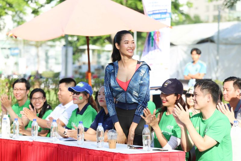 Diện trang phục năng động, khỏe khoắn và đơn giản, Á hậu Hoàng Thùy hòa mình vào đường đua, cùng các tình nguyện viên tận hưởng không khí trong lành của buổi sáng sớm. Không những thế, Á hậu Hoàng Thùy còn “khoe” khả năng nói tiếng Anh chuẩn qua đoạn clip ngắn quay cảnh người đẹp đang chạy bộ.