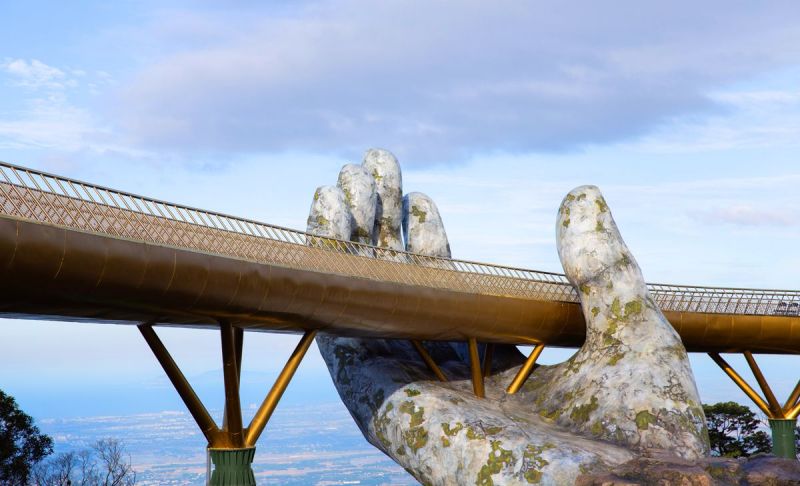 Cầu Vàng nằm ở độ cao 1414m so với mực nước biển. Cầu dài 148,6m được thiết kế mạnh mẽ nhưng vẫn mềm mại được nâng đỡ bởi tạo hình bàn tay khổng lồ như của thần linh vươn ra từ thung lũng. Tổ hợp cầu 1 như 1 biểu tượng, ấn tượng ở bất kì góc nhìn nào: trên cáp treo hay từ các vườn hoa, làng Pháp. Cầu Vàng gồm 8 nhịp, mặt cầu được hoàn thiện bằng gỗ kiềng dày, lan can được mạ vàng sang trọng, khiến cây cầu trở nên rực rỡ dưới ánh nắng mặt trời.