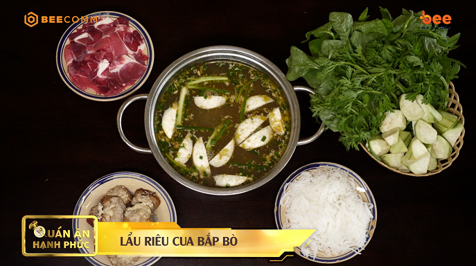 Món “lẩu riêu cua bắp bò, các phần riêu cua được làm kỹ lưỡng, tẩm ướp gia vị vừa phải rồi cho vào mai cua đồng vô cùng đặc biệt. Nước lẩu ngọt thanh nhưng đậm đà vị cua. Các phần rau, nấm, tỏi phi thơm lừng hòa quyện vừa phải trong nước lẩu. Phần bắp bò tươi được cắt mỏng vừa phải, mỗi lần ăn, người dùng sẽ nhúng bắp bò sơ qua nước lẩu rồi dùng ngay, giữ nguyên độ tươi ngon của món ăn.