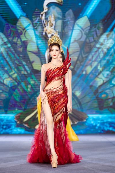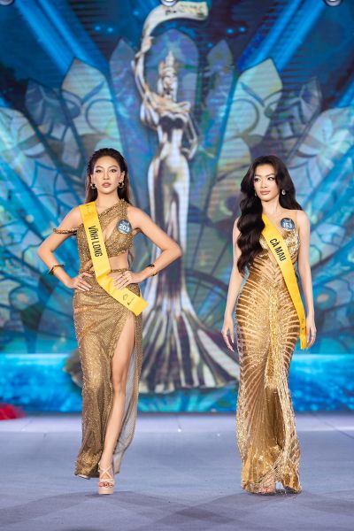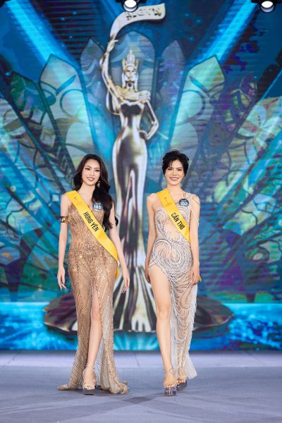 Trên sân khấu, thí sinh lần lượt nhận dải sash đại diện cho tỉnh thành của mình từ Chủ tịch Phạm Kim Dung và Đương kim Hoa hậu Võ Lê Quế Anh, chính thức bắt đầu hành trình chinh phục vương miện cao quý.