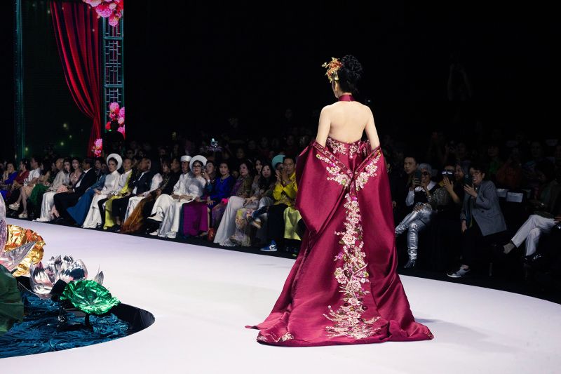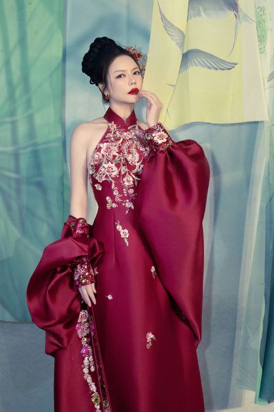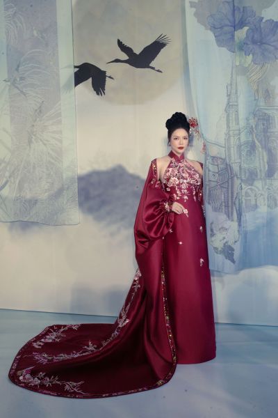 Chỉ trong một thời gian ngắn, chiếc váy hồng ngọt ngào đã được thay thế bằng bộ áo dài cách tân với chi tiết cổ yếm tinh tế – một biểu tượng của sự quyến rũ kín đáo trong văn hóa Việt Nam. Chiếc áo dài cổ yếm đỏ thắm đã phát huy tối đa lợi thế hình thể của cô, khoe khéo bờ vai thon thả và tấm lưng ngọc ngà, nhưng vẫn giữ được sự cao sang, đài các cần thiết cho một sàn diễn thời trang cao cấp.