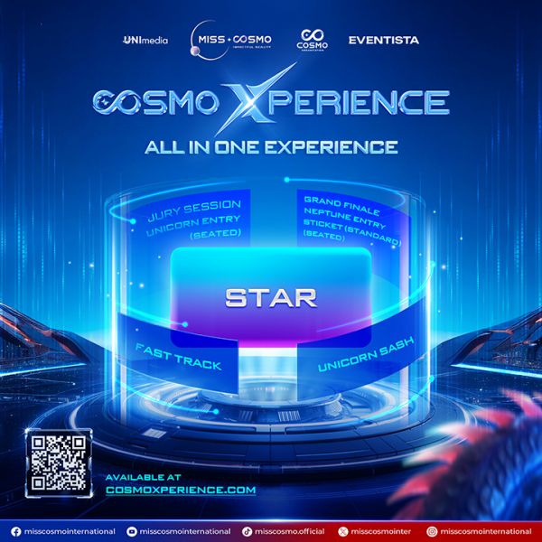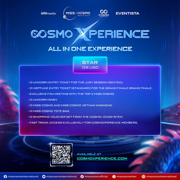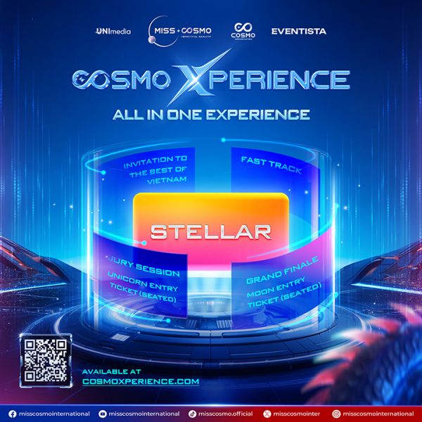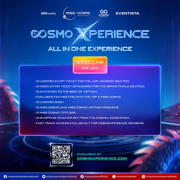 Hai gói Star và Stellar được mở bán chính thức vào 20h00 ngày 16/10/2025 trên nền tảng https://cosmoxperience.com. Đây là cơ hội để người hâm mộ Miss Cosmo 2025 trải nghiệm hành trình sắc đẹp quốc tế ngay tại Việt Nam.