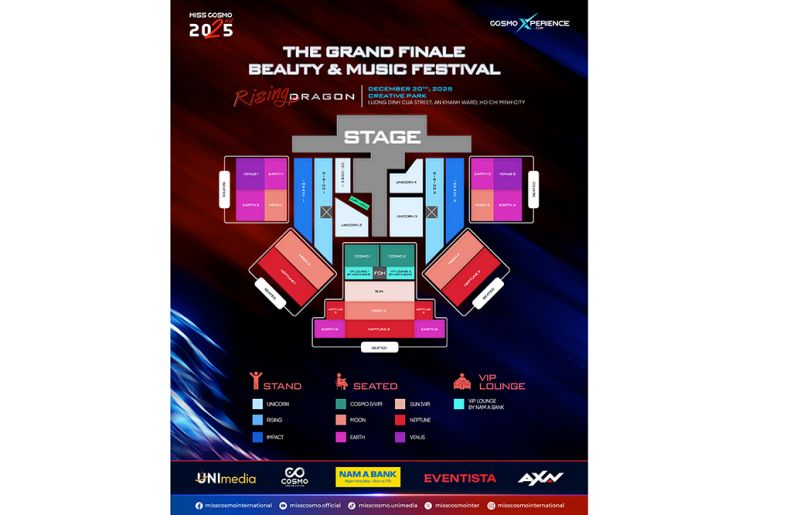 Đến với đêm Chung kết Miss Cosmo 2025, khán giả sẽ bước vào vũ trụ Cosmo – hành trình qua các “hành tinh” Cosmo, Moon, Earth, Sun, Neptune, Venus, Unicorn, Rising, Impact, tương ứng với từng hạng vé trong tổng thể không gian sân khấu.
