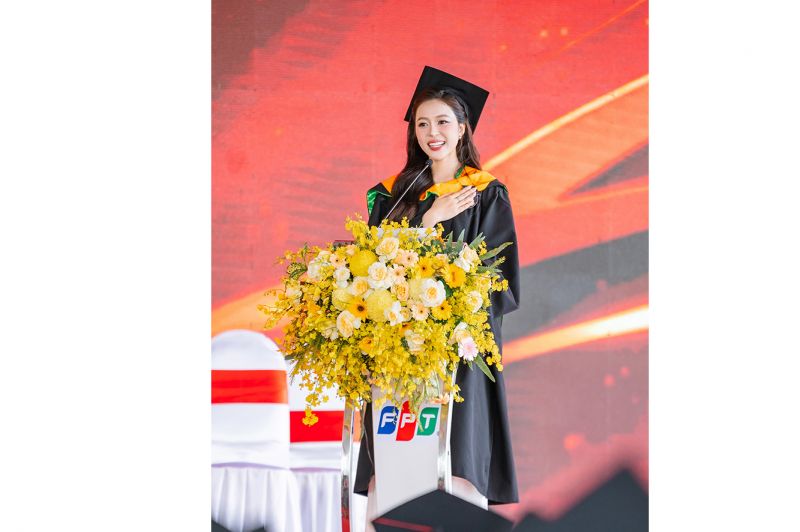 Trong đó có đoạn chia sẻ: “Chúng em thật sự may mắn khi được là một phần của ngôi trường này – nơi tôn vinh sự khác biệt, khuyến khích mỗi cá nhân thể hiện màu sắc riêng, và dạy chúng em rằng: mỗi cá nhân đều là một phiên bản độc nhất, mỗi hành trình đều đáng trân trọng. Và hôm nay, khi cùng nhau đứng trên sân khấu này – trong khoảnh khắc của niềm tự hào và biết ơn – chúng em hiểu rằng: không có nỗ lực nào là vô ích. Mỗi giọt mồ hôi, mỗi đêm thức trắng, mỗi lần vấp ngã… đều góp phần tạo nên thành công của ngày hôm nay – thành công mang tên Tân Cử nhân FPTU”.