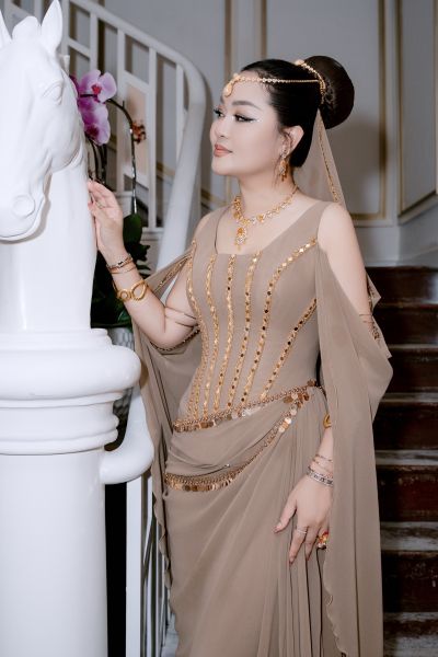 Khoác lên mình thiết kế dạ hội tông nâu ánh kim mềm mại, điểm xuyết chi tiết ánh vàng dọc thân váy, Hoàng Thanh Nga mang đến vẻ đẹp vừa hiện đại, vừa phảng phất nét cổ điển của các quý tộc phương Đông. Bộ váy tôn lên vóc dáng thanh thoát cùng phong thái tự tin, sang trọng của nữ doanh nhân từng đạt danh hiệu Á hậu 1 Hoa hậu Quý bà Hoàn vũ Thế giới 2022.