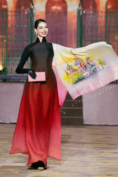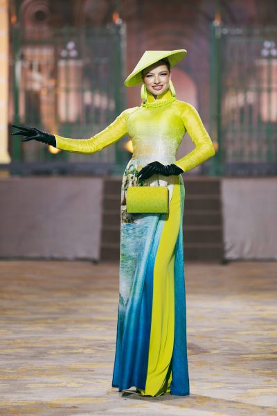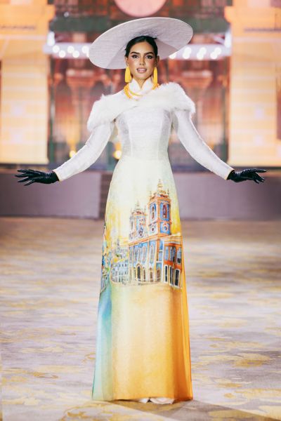 Đến với phần trình diễn áo dài hiện đại, các thí sinh Miss Cosmo 2025 hào hứng khi lần đầu được diện bộ trang phục là hiện thân cho nét đẹp văn hoá Việt Nam. Mỗi tà áo dài là một tác phẩm hội hoạ thủ công độc bản và tinh xảo, lấy cảm hứng từ những kỳ quan thiên nhiên, những tuyệt tác kiến trúc, nghệ thuật đến từ chính quốc gia của họ.