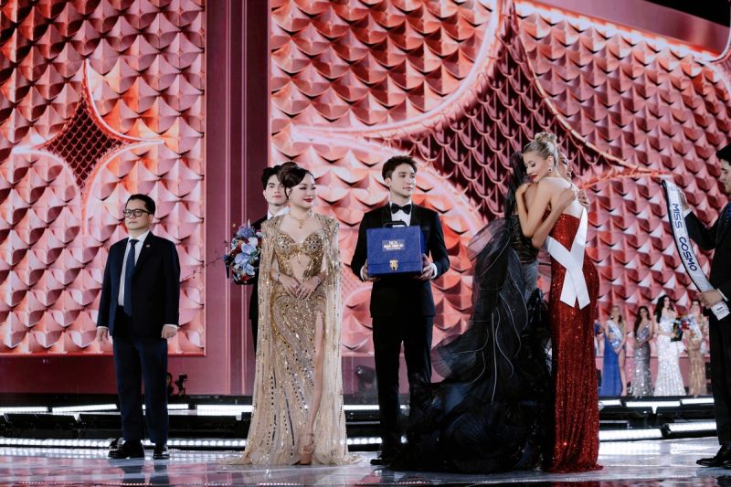Đặc biệt, tại khoảnh khắc trao vương miện Miss Cosmo – được chế tác bởi chính thương hiệu Ngọc Châu Âu do Hoa hậu Hoàng Thanh Nga sáng lập – hình ảnh cô trong bộ trang phục ánh vàng sang trọng mang ý nghĩa biểu tượng mạnh mẽ. Không chỉ là người đồng hành, cô còn là đại diện cho tinh thần sáng tạo, sự tôn vinh giá trị bền vững và niềm tự hào của ngành chế tác trang sức Việt Nam trên sân khấu sắc đẹp toàn cầu.