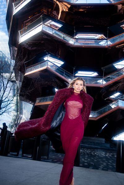 Ở set hình mở đầu, đương kim Miss Cosmo 2025 xuất hiện trong thiết kế áo choàng lông tông đỏ mận, phom dáng rộng với kết cấu nổi bật. Trên nền kiến trúc kim loại và kính đặc trưng của “thành phố không ngủ”, tổng thể tạo nên sự tương phản rõ nét giữa chất liệu mềm mại và hình khối kiến trúc mạnh mẽ.