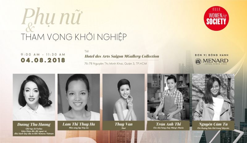 Buổi hội thảo ELLE Women In Society: PHỤ NỮ VÀ THAM VỌNG KHỞI NGHIỆP sẽ được tổ chức vào 9:00 – 11:30 sáng ngày 4/8 tại Hotel Des Arts Saigon, 76-78 Nguyễn Thị Minh Khai, Quận 1, TPHCM. Đăng ký ngay tại đây: http://shop.menard.vn/talk-show-phu-nu-va-tham-vong-khoi-nghiep/