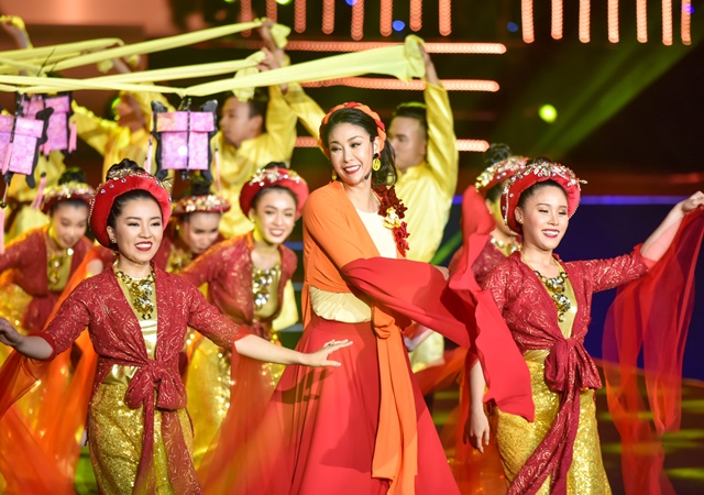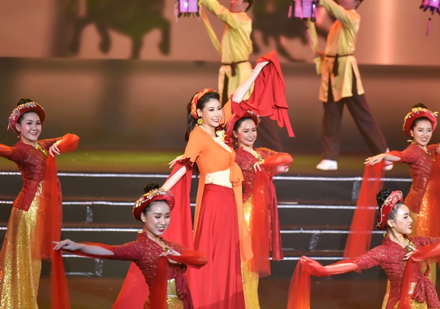 Trong chương trình tối qua, ngoài vai trò là giám khảo và là khách mời đặc biệt, Hà Kiều Anh còn tham gia biểu diễn. Cô thể hiện ca khúc Yêu Cái Đèn Cù (tác giả: Song Ngọc) trong trang phục áo tứ thân cùng vũ đoàn múa minh hoạ trên sân khấu Tuần Châu.