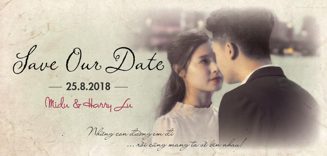 Chiếc thiệp cưới bị hé lộ có thiết kế đơn giản, in hình ảnh lãng mạn của Harry Lu - Midu đi kèm dòng trích dẫn ngọt ngào đầy ẩn ý: Những con đường em đi rồi cũng mang ta về bên nhau!