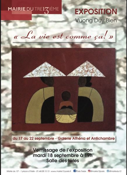 Với chủ đề “Cuộc sống là như vậy …” triển lãm của nghệ sĩ Vương Duy Biên sẽ giúp giới yêu nghệ thuật phương Tây được tiếp cận và hiểu rõ hơn về nét văn hoá Việt Nam. Lịch trình triển lãm tại Pháp: Từ 18 – 22 / 9: Tại Toà thị chính Quận 13, Paris và Từ 26 – 29/9: Tại Toà thị chính Versailles, Tp Versailles.