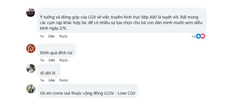 Chia sẻ với CGV, nhiều khán giả cho biết dù là xem gián tiếp, nhưng họ cảm thấy vô cùng xúc động khi được chứng kiến những khoảnh khắc đẹp được truyền từ thủ đô Hà Nội. Đặc biệt, các bạn trẻ cũng bày tỏ sự thích thú và tự hào khi được tiếp cận lịch sử một cách sống động, truyền cảm hứng.