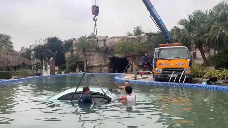 Đạo diễn Lương Đình Dũng ở hậu trường quay cảnh chiếc xe chìm xuống nước.