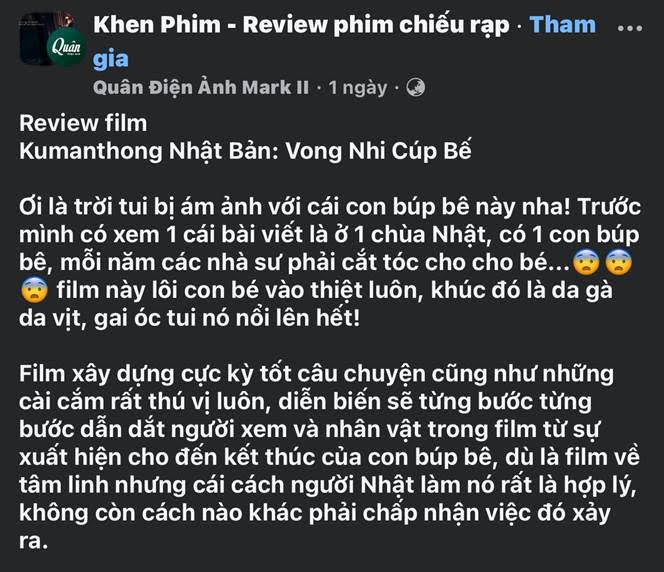 Sau buổi chiếu sớm đặc biệt vào ngày 08.12 vừa qua, Kumanthong Nhật Bản: Vong Nhi Cúp Bế đã nhận được nhiều lời khen ngợi và điểm 9-10 từ khán giả. Qua đó, một số đánh giá dành lời khen cho bối cảnh phim, tạo nên “không gian rùng rợn đáng sợ” cùng hình tượng búp bê ma xinh đẹp, “thần thái” bậc nhất màn ảnh từ trước đến nay. Qua đó, phim cũng tạo được mức độ kinh dị và kịch tính chân thực, kết hợp âm thanh “ám ảnh hơn cả chuông báo thức” và cài cắm nhiều chi tiết ấn ý, đan xen thành một bức tranh bi kịch chung đầy sức hút.