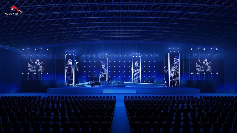 Trọng tâm sân khấu được cấu trúc bởi bốn trụ LED khổng lồ, sừng sững như những cột mốc thời gian, khắc họa chân dung bốn nhạc sĩ huyền thoại của âm nhạc Việt Nam. Trên nền trời ánh sáng, những hình ảnh hiện lên hư ảo như khói sương nhưng thấm sâu vào ký ức: một Văn Cao cổ điển và trầm tĩnh như buổi bình minh của nền âm nhạc mới; một Phạm Duy đa cảm, đa thanh, như dòng sông chưa từng ngừng chảy; một Trịnh Công Sơn suy tư, trữ tình, mang theo mưa nắng của kiếp người; và một Trần Tiến phóng khoáng, gai góc nhưng tràn đầy sinh lực, tựa ngọn gió đại ngàn.