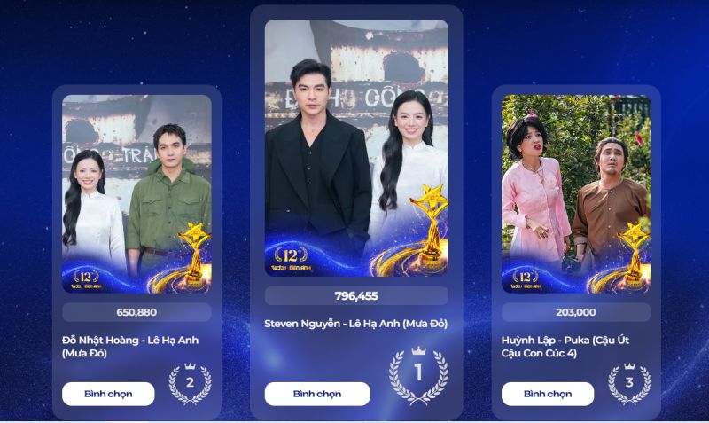 Riêng hạng mục ‘Cặp đôi được yêu thích nhất’ tiếp tục là một trong những đường đua giàu cảm xúc nhất của Ngôi Sao Xanh 2025. Các cặp đôi dẫn đầu đều nhận được sự ủng hộ mạnh mẽ từ người hâm mộ, với lượng bình chọn tăng đáng kể trong giai đoạn nhân 3 điểm. Sự gắn kết giữa hai nghệ sĩ trên màn ảnh, cùng hiệu ứng lan tỏa ngoài đời thực, đã góp phần tạo nên cuộc cạnh tranh gay cấn cho đến những giờ cuối cùng.